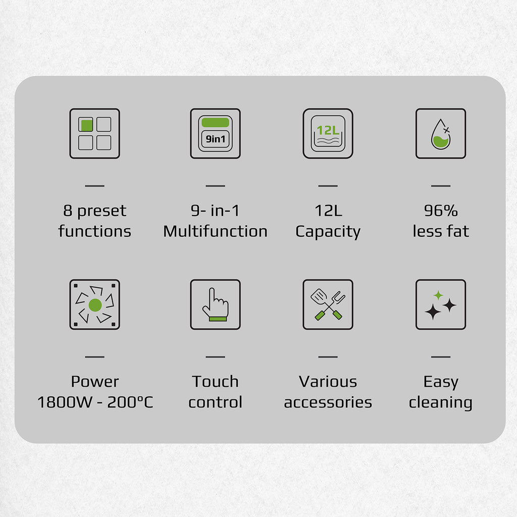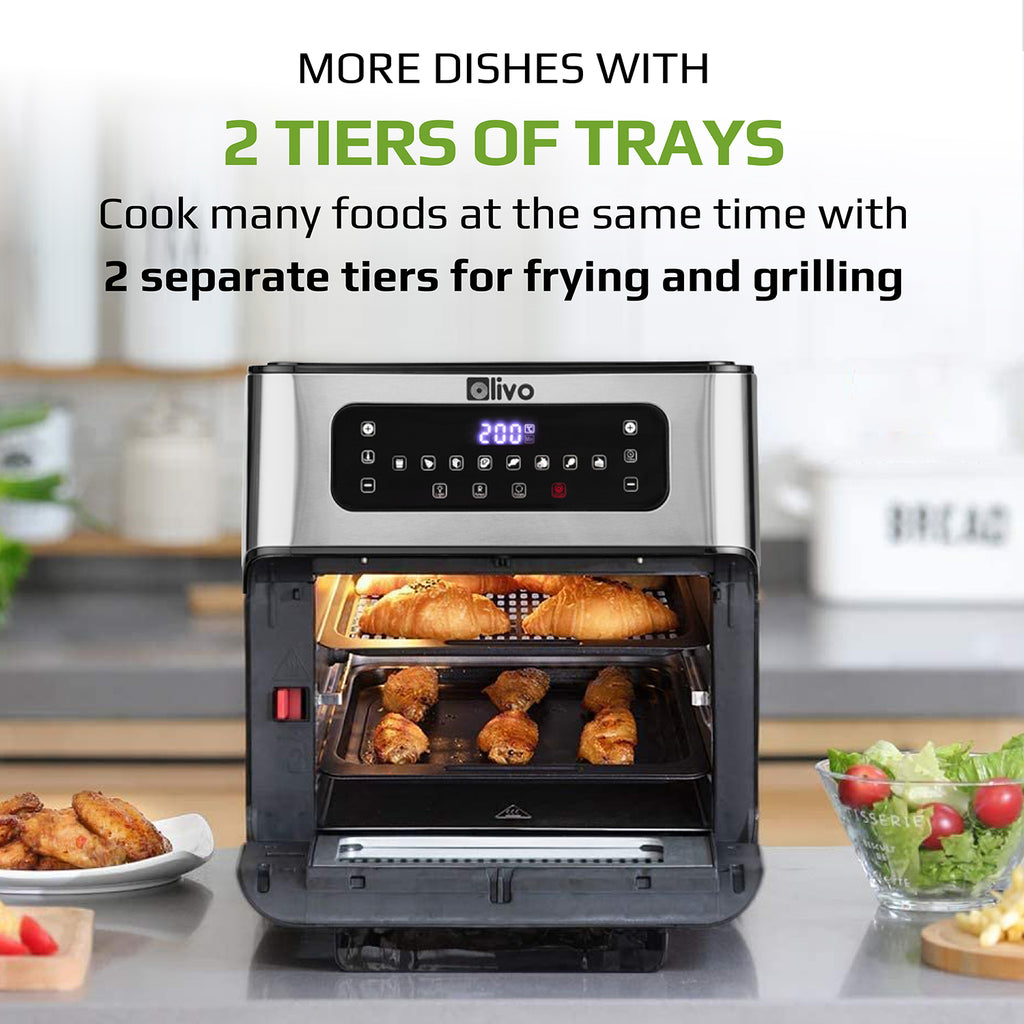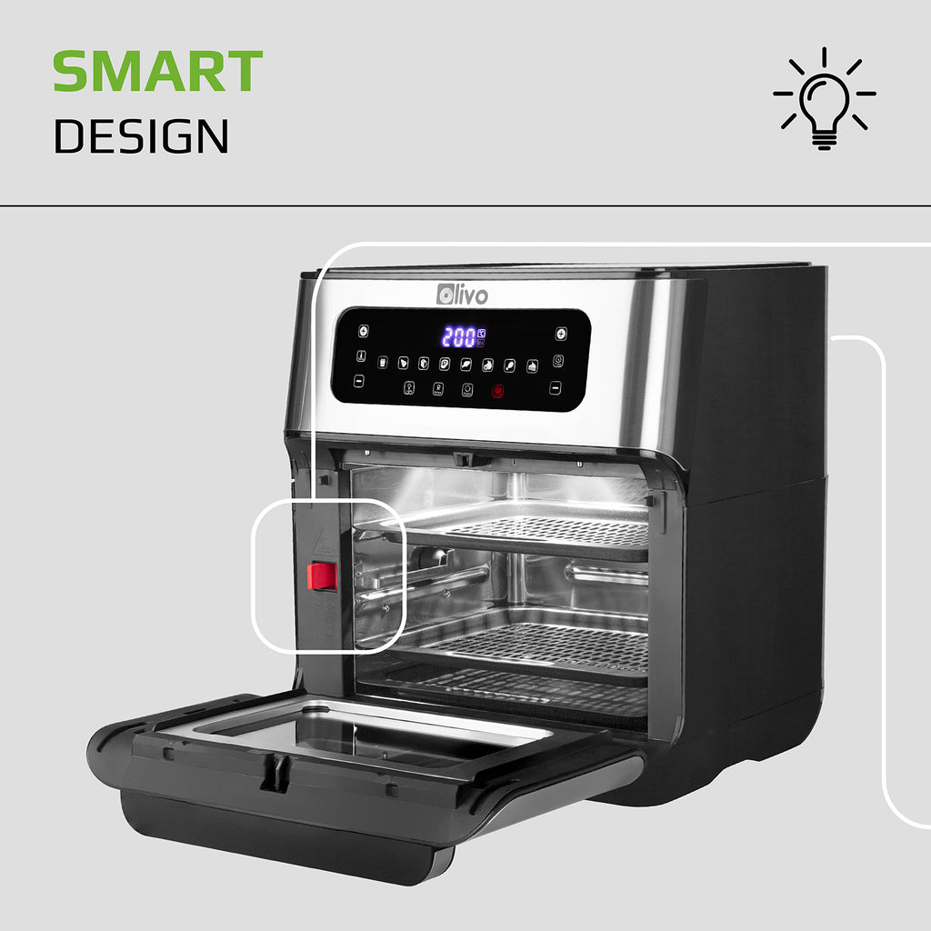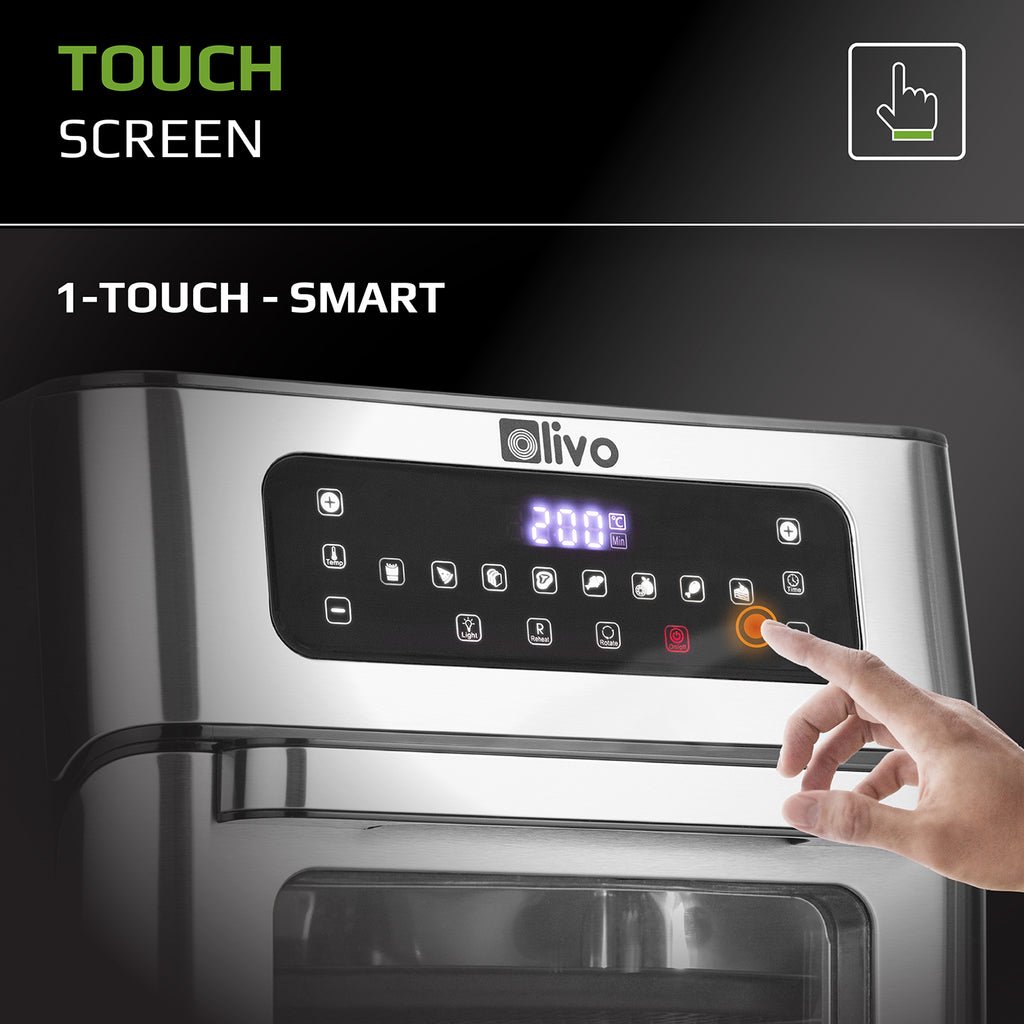 - The modern and luxurious touch screen display of the OLIVO AF12 air fryer is easy to operate simply with 1-touch to control 8 preset functions: grilling fish, roasting meat, dehydrating, defrosting food, etc. and many other functions.