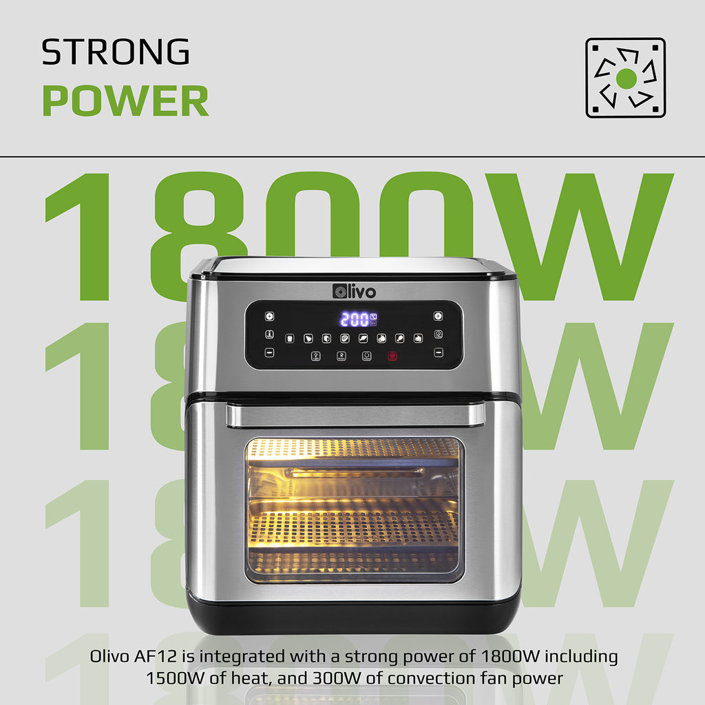 - The OLIVO AF12 air fryer is integrated with a large power of 1800W including 1500W of heat, and 300W of convection fan power to help you cook food evenly, and save cooking time. Over 96% less fat than conventional frying. Applying 360° hot air circulation technology, the OLIVO AF12 air fryer circulates super-hot air around your food instead of oil to cook, which penetrates the inside of food, makes your food cooked evenly without turning, and locks in moisture. You can enjoy your favorite meals without worrying about the excess calories and fats.