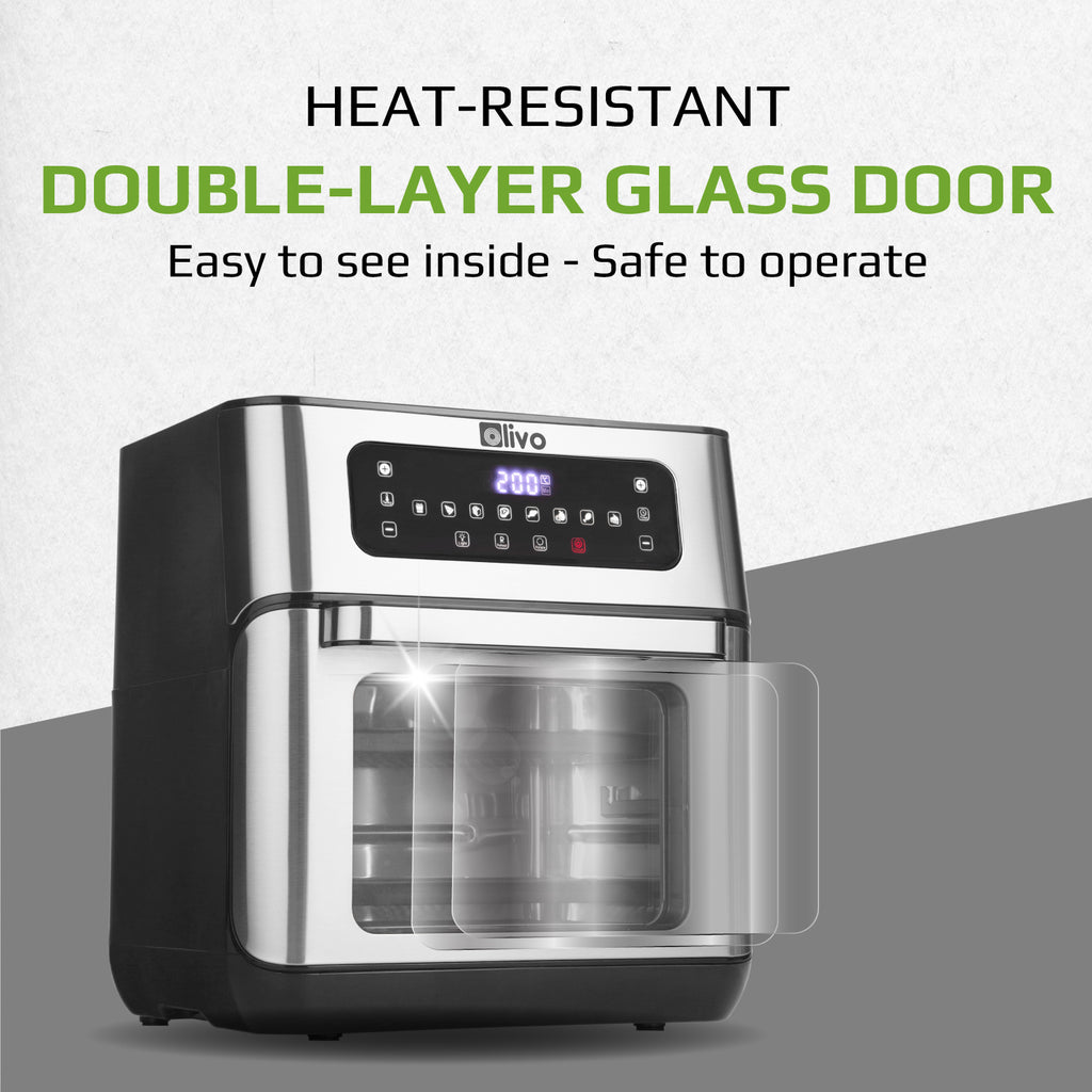 - The OLIVO AF12 air fryer has a light inside the oven cavity, making it easy to see the frying and roasting process inside through the smart heat-resistant double-layer glass door.
