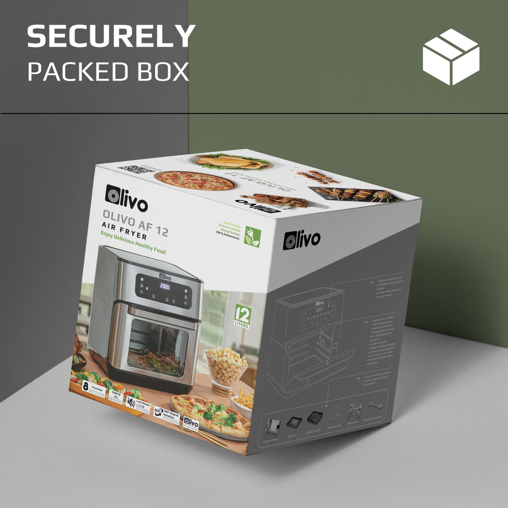 - In addition, compared with conventional frying or when you use a deep fryer, the OLIVO AF12 eliminates the risk of hot oil spills and splashes, and makes frying safe even with kids or pets running around.