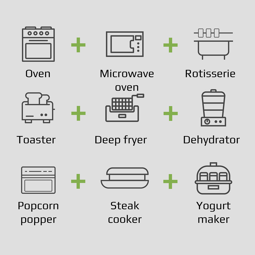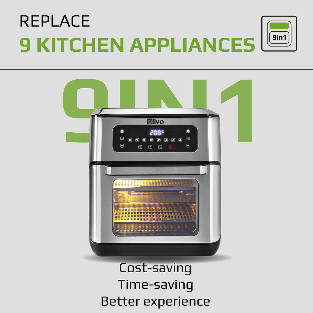 - Buy 1 get 9 that is completely true when you own OLIVO AF12 multi-functional air fryer. This cooker could work as an air fryer, a rotisserie, dehydrator, pizza oven, toaster, popcorn popper, bottle warmer, microwave oven, etc.