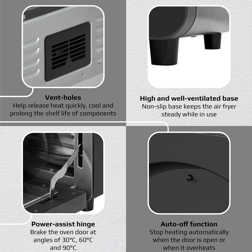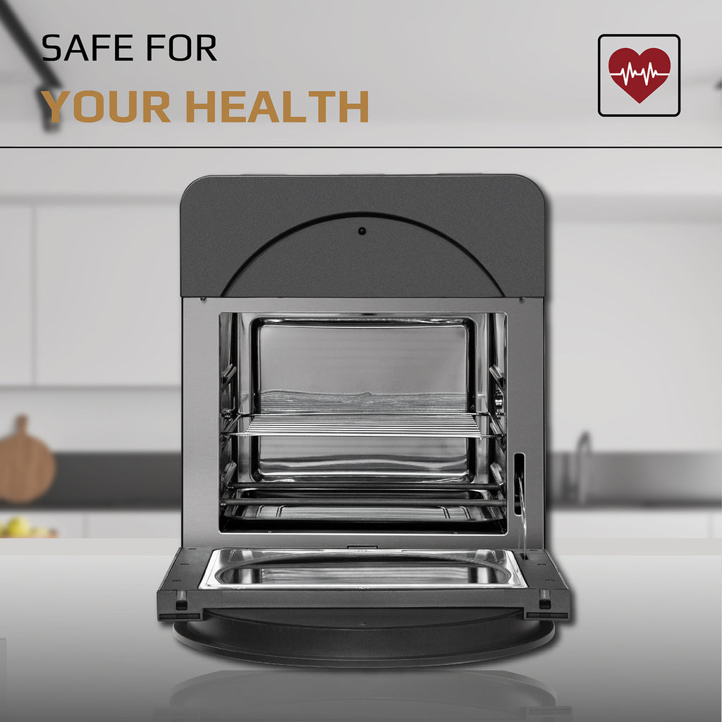 - The transparent glass door also helps users easily observe the food during cooking, avoiding overtime, overheating and burning food. Therefore, you can control the doneness of food most easily, especially when making cakes. You also do not need to open and close the air fryer during cooking, which causes heat loss, and does not affect the operation of the air fryer and the taste of food. The double-layer glass door also makes it easier to clean after cooking.