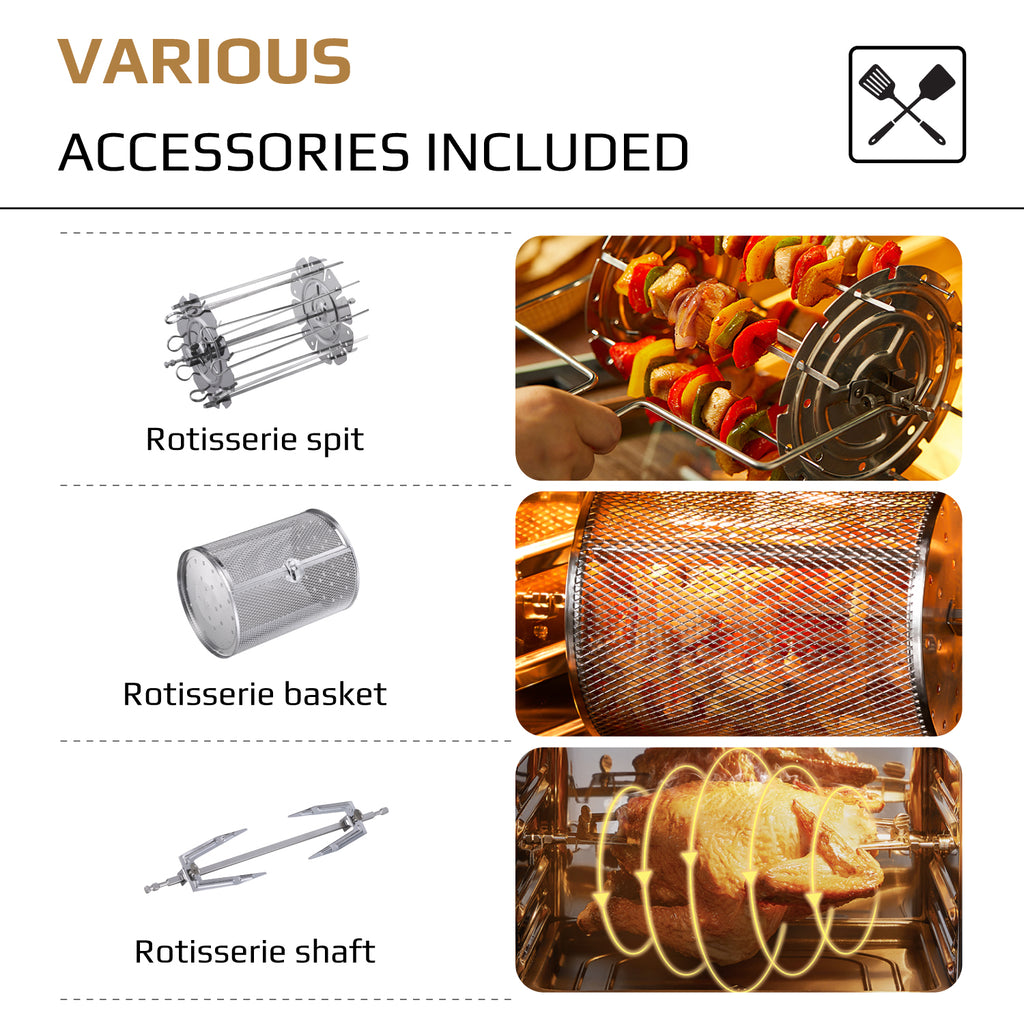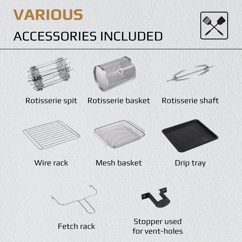 - Variety of accessories is a perfect point that can captivate any housewife, even the most fastidious ones. When buying OLIVO AF15, you will have a full set of versatile accessories supporting to cook a variety of dishes, including: Rotisserie basket, cookbook, instruction manual, rotisserie spit, drip tray, mesh basket, fetch rack, rotisserie shaft, and non-stick wire rack.