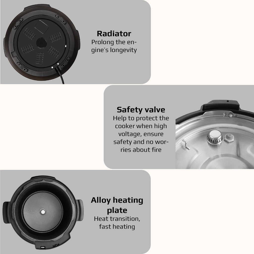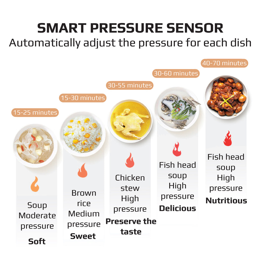 The cooker is equipped with an absolutely safe pressure valve, which keeps the pressure when cooking, and releases the pressure after cooking is complete. The pressure valve combined with electronic sensors helps to adjust the correct pressure level in the cooker during cooking, you no longer have to worry about overpressure causing the risk of explosion like traditional pressure cookers.