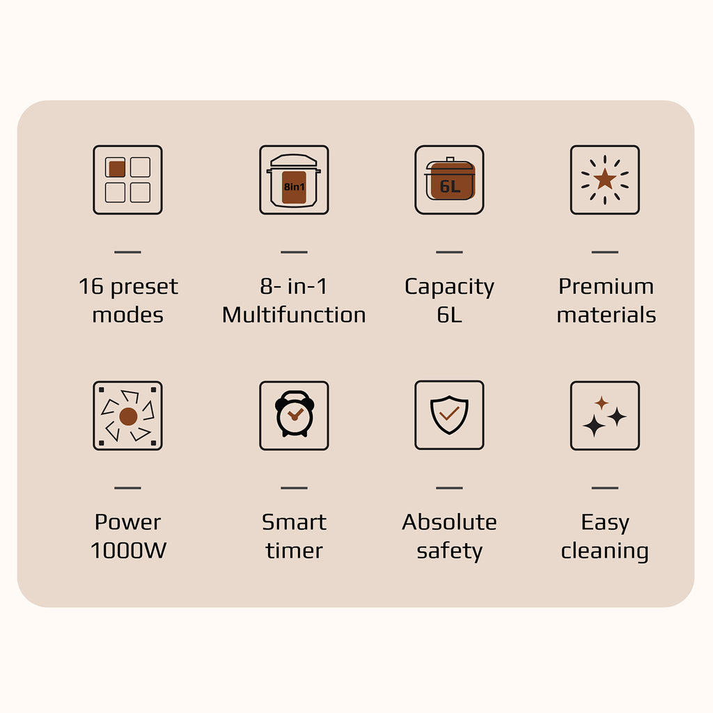 With 16 preset modes, your work is just to spice up your food in the pot, just press one button and wait for the finished product to be an very delicious dish right on the dining table.