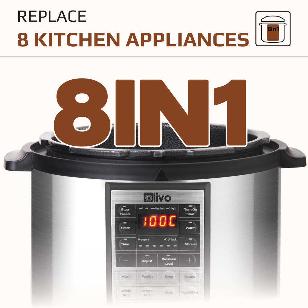 Olivo PC60 electric pressure cooker can replace 8 types of kitchen appliances such as mechanical pressure cooker, rice cooker, hot pot, frying pan, grill pan, steamer, yogurt maker, conventional cooking pot.