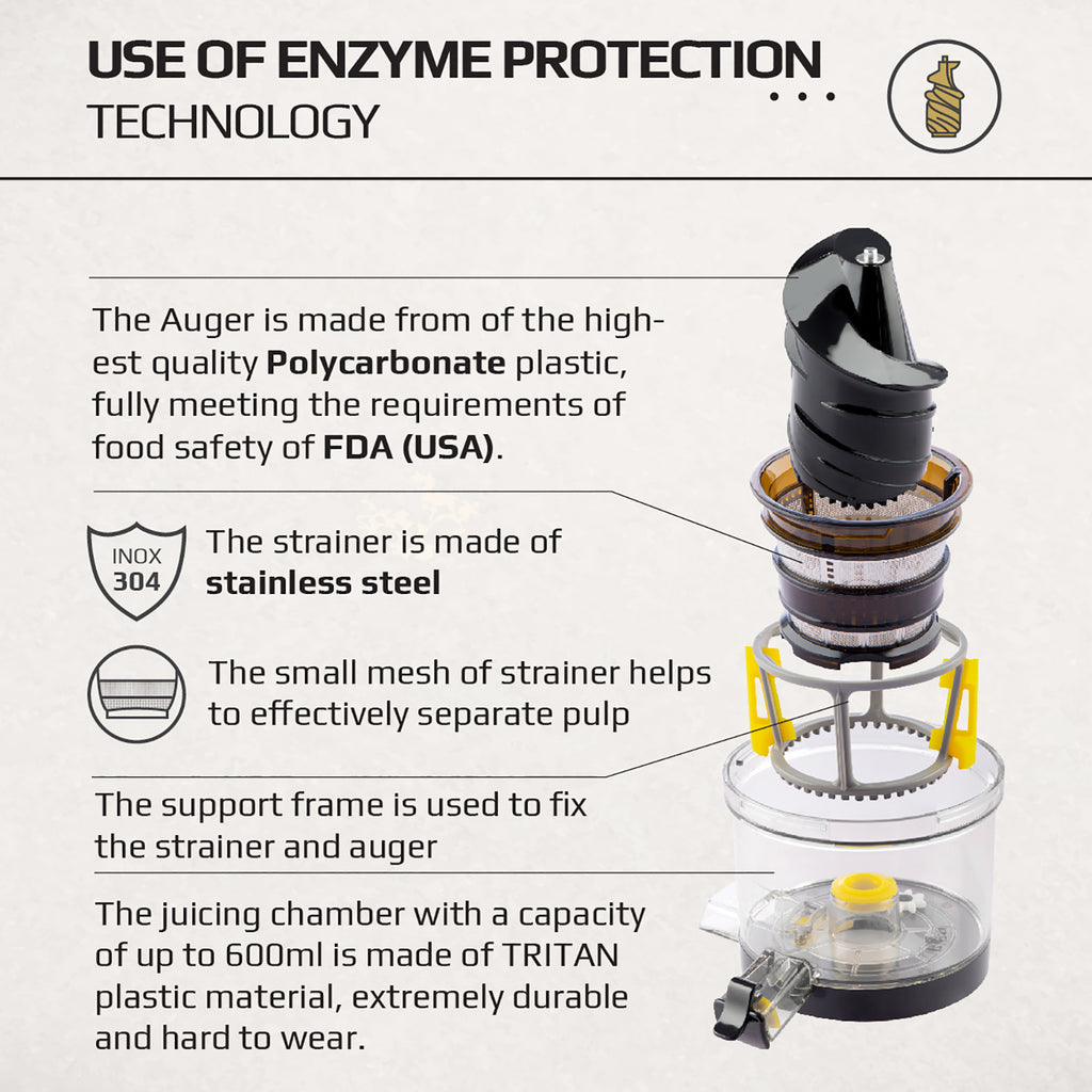 - Unlike traditional centrifugal juicers, the OLIVO SJ189 Slow Juicer uses Enzyme Protection Technology (EPT); the auger will slowly crush, squeeze and use pressure to maximize juice output. This process minimizes exposure of raw foods to heat or friction, and provides a premium juice that retains the same amount of enzymes and nutrients. With previous models of centrifugal grinders, when food is heated and exposed to oxygen, it begins to oxidize (think when you cut an apple and it starts to turn brown) that is the result when the fruit’s cell structure is broken.