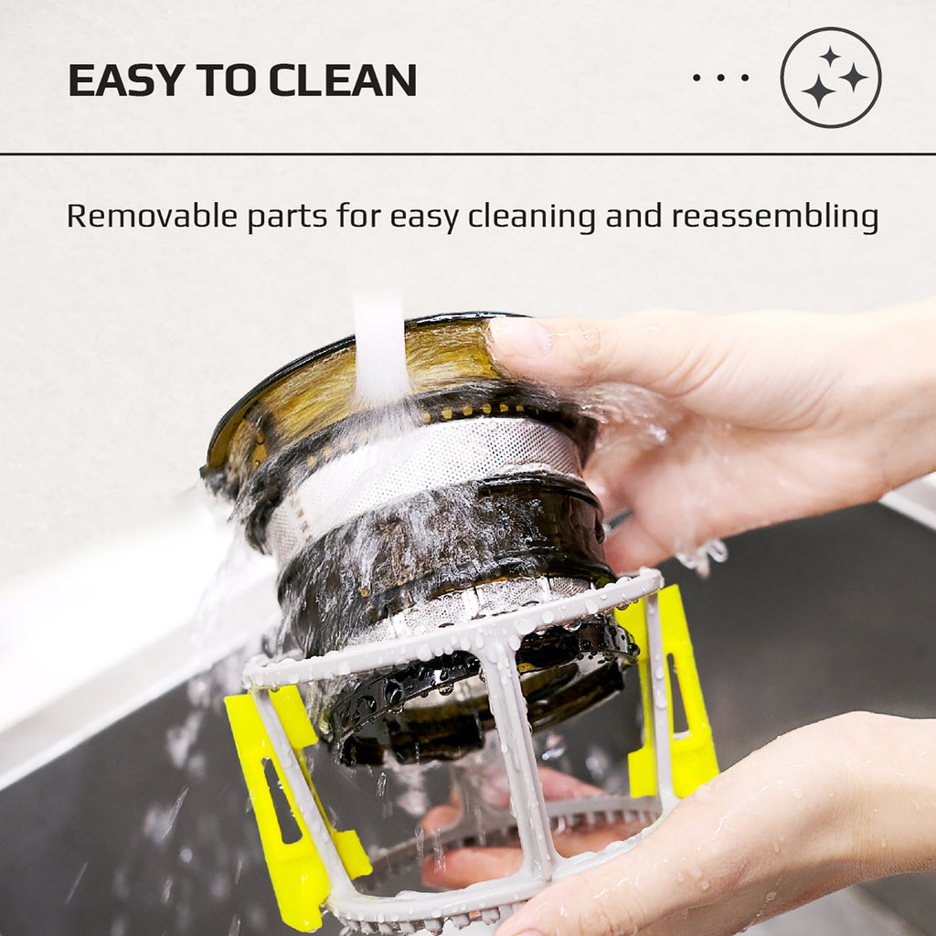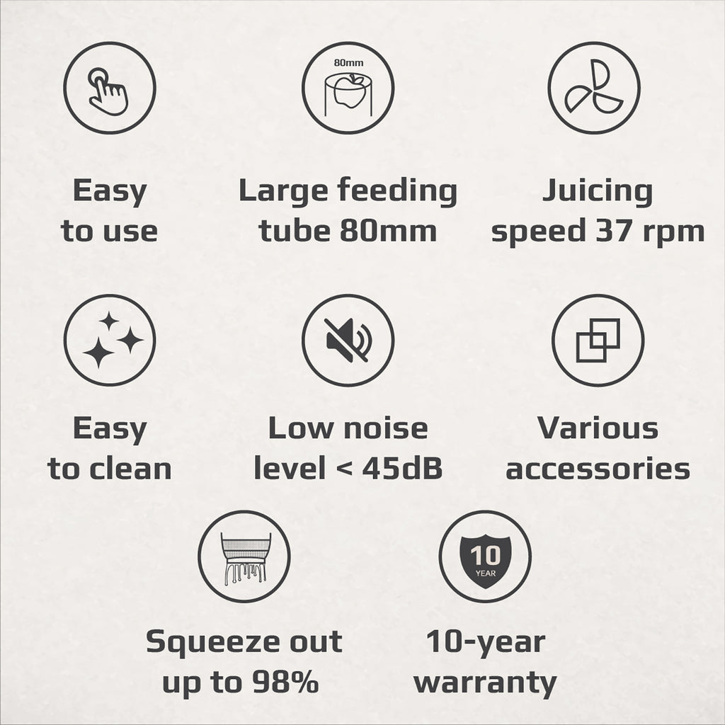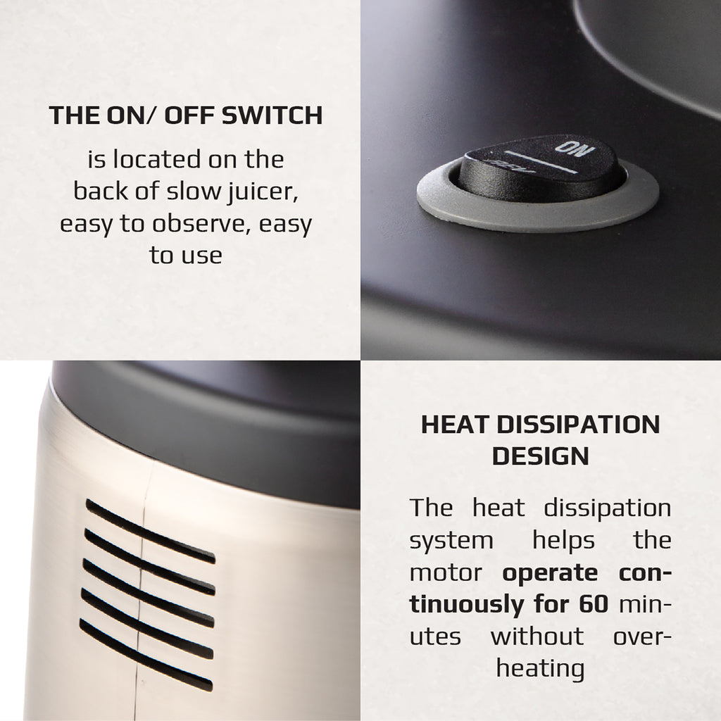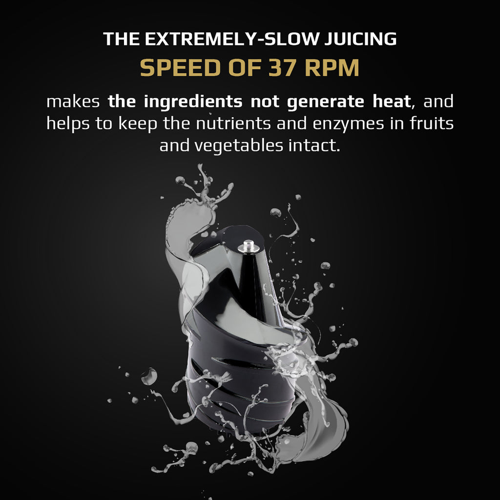 - The slow juicing speed of 37 rpm makes the ingredients not generate heat, helping to keep the nutrients and enzymes in fruits and vegetables intact.