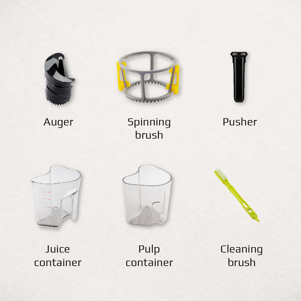 - The auger has been upgraded to make it easier to roll ingredients down the pipe and start the juicing process. The large shaft works well for squeezing green vegetables such as celery, wheatgrass, kale, etc.